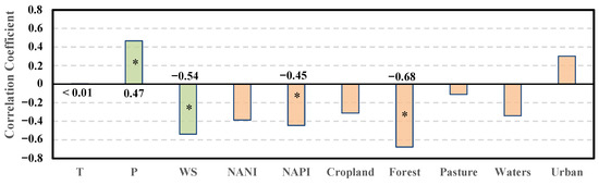 The correlation coefficients between driving factors and the annual average DOCs in Dianchi. Green represents natural factors, while orange represents anthropogenic factors, and “*” represents significance.