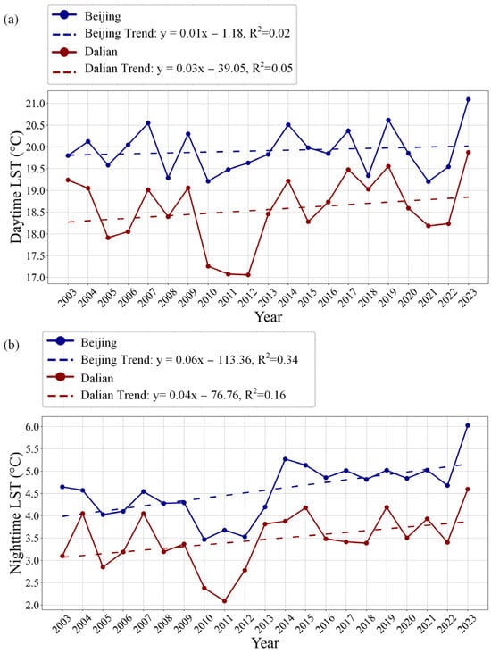 Analysis of LST trends from 2003 to 2023: (a) Beijing; (b) Dalian.