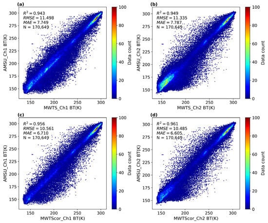 Scatter plots of observed brightness temperatures from corresponding channels of MWTS-III and AMSU-A before and after applying the correction during 26–27 June 2024: panels (a,c) show scatter plots for the 23.8 GHz channel of MWTS-III before and after correction, while panels (b,d) present scatter plots for the 31.4 GHz channel of MWTS-III before and after correction.