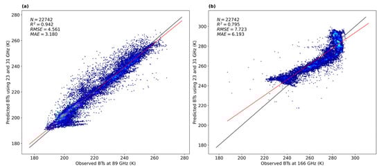 Scatter plots illustrating the statistical relationship between the brightness temperatures at the 89 GHz (a) and 166 GHz (b) channels, derived from the 23.8 GHz and 31.4 GHz channel data, and the corresponding observed brightness temperatures at these channels. The black line denotes the 1:1 reference line, while the red line represents the fitted regression line between the two datasets.