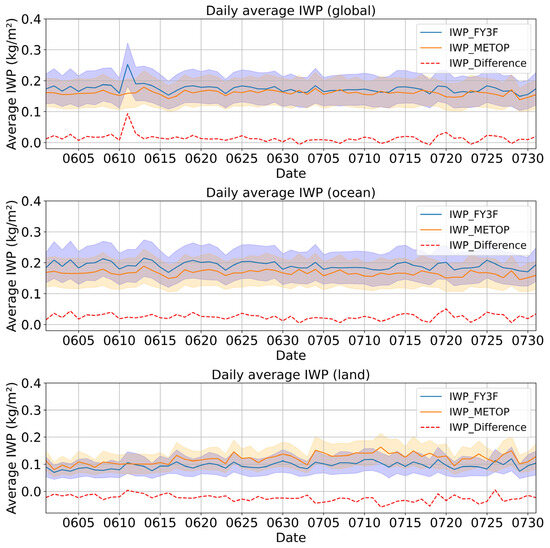 Figure 4 illustrates the daily mean values and differences in IWP retrieved from two satellite datasets (FY-3F and METOP-C) over global, oceanic, and terrestrial regions from June to July 2024.