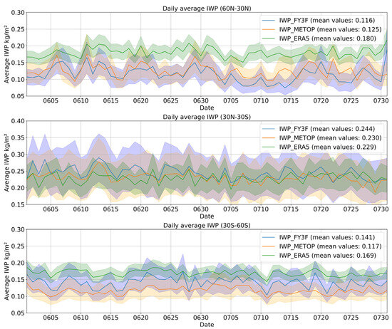 Time series of IWP variations in oceanic regions across different latitude bands: (top) 30°N–60°N, (middle) 30°N–30°S, and (bottom) 30°S–60°S. The blue lines and shaded areas represent daily mean values and standard deviations derived from FY-3F observational data, the orange lines and shaded areas correspond to values from METOP-C observational data, and the green lines and shaded areas represent corresponding values from ERA5 reanalysis data.
