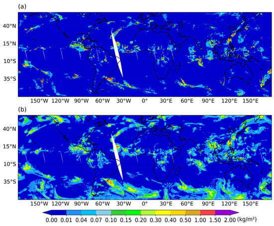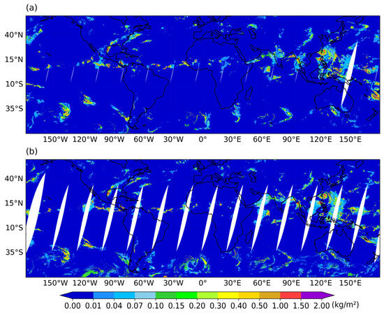 Global distribution of IWP on October 01, 2024: (a) IWP retrieved from FY-3F observation data; (b) IWP from ERA5 reanalysis dataset.