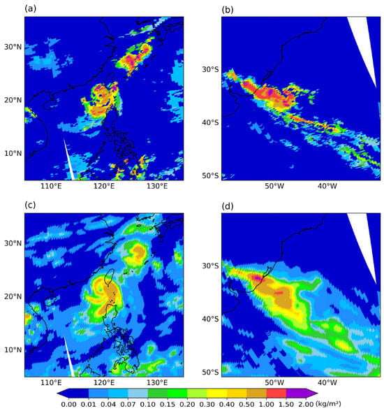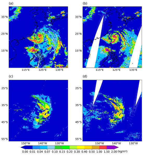 IWP retrieval results in tropical and extratropical cyclones: (a) IWP from FY-3F observation data in tropical cyclone, (b) IWP from FY-3F observation data in extratropical cyclone, (c) IWP from ERA5 data in tropical cyclone, and (d) IWP from ERA5 data in extratropical cyclone.