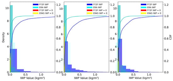Probability density distribution and cumulative distribution function curves of IWP: (left) 30°N–60°N, (middle) 30°N–30°S, and (right) 30°S–60°S. The blue bars represent the probability density distribution, and the blue lines represent the cumulative distribution function curves retrieved from FY-3F observations, while the cyan bars and lines represent corresponding values from ERA5 reanalysis data. The red and yellow bars represent the probability density distributions of IWP values equal to zero from FY-3F and ERA5, respectively, while the orange bars indicate their overlapping areas.