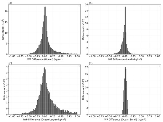 Histogram distribution of differences between IWP retrievals and ERA5 data (1 October 2024): (a) oceanic regions, (b) land regions, (c) oceanic regions with high IWP values (IWP > 0.1 kg/m2), and (d) oceanic regions with low IWP values (IWP < 0.1 kg/m2).