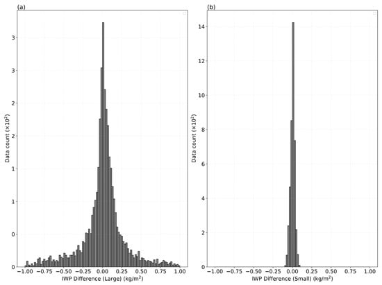 Histogram distributions of differences in IWP retrievals between FY-3F and METOP-C data on 24 July 2024: (a) high IWP values (IWP > 0.1 kg/m2), and (b) low IWP values (IWP < 0.1 kg/m2).