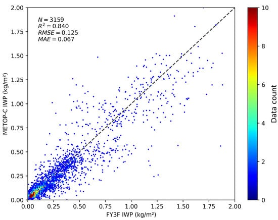 Scatter plot comparing IWP data from FY-3F and METOP-C satellites.