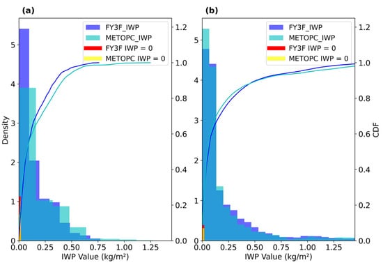 Probability Density Function (PDF) and Cumulative Distribution Function (CDF) of IWP for extratropical and typhoon regions on 24 July 2024. The left panel (a) corresponds to the extratropical region, while the right panel (b) represents the typhoon region. In these plots, blue bars and lines indicate IWP retrieved from FY-3F observational data, whereas cyan bars and lines represent the METOP-C IWP products. The red and yellow bars represent the probability density distributions of IWP values equal to zero from FY-3F and METOP-C, respectively, while the orange bars indicate their overlapping areas.