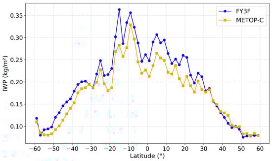 Distribution of IWP across latitude bands, based on FY-3F and METOP-C satellite data from June to July 2024.