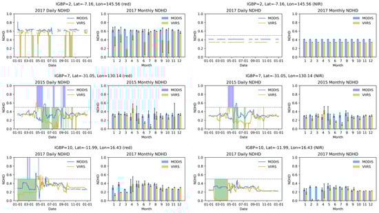 Figure 10 shows the daily and monthly NDHDs for the four BELMANIP sites with different IGBP classes, with the blue and green vertical lines indicating that fvol is equal to zero for the corresponding dates. Importantly, the stability of most NDHD time-series results fluctuates in the presence of a zero-valued fvol because the weighting coefficient of the volumetric scattering kernel fails to provide enough information. However, if fvol is zero, fgeo still provides anisotropic scattering information, which helps maintain relatively small fluctuations in NDHD. When the value of fgeo is zero or very small, it is insufficient to support the stability of the NDHD and rapidly converges to zero. Moreover, the presence of zero-valued pixels increases the standard deviation of the monthly averaged NDHD, and the VIIRS data and the derived indices exhibit greater fluctuations and uncertainties.