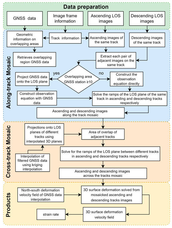 The processing procedure is structured in two stages. First, along-track processing involves aligning the LOS velocity field to the GNSS reference frame using GNSS station data within the frame. Subsequently, the along-track frames are iteratively adjusted by enforcing consistency in overlapping region values for the same track. Second, cross-track processing addresses discrepancies in cross-track overlapping regions. Here, track information is corrected using interpolated GNSS data, followed by a secondary refinement of the LOS velocity field through the integration of relative displacement fields between adjacent tracks. Finally, the overall experimental process of this study is shown in Figure 1.