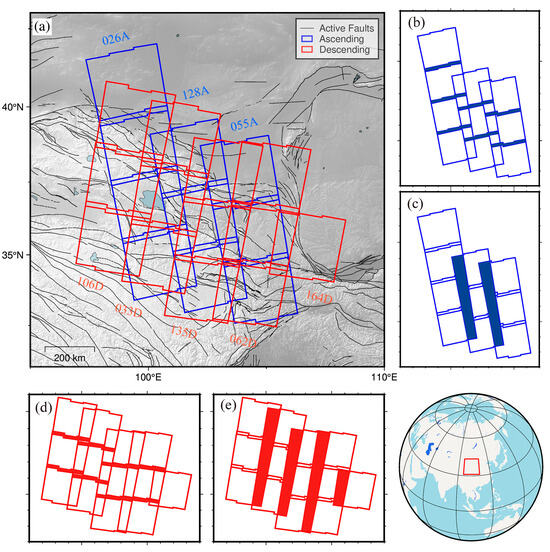 Overview map of the study area. Subfigure a shows the spatial distribution of InSAR tracks in the study area. Among them, the red frame represents the ascending tracks, and each subbox represents an observation frame. Similarly, the blue frame represents the descending tracks, and each subframe also represents an observation frame. Subgraphs (b,c) respectively show the observation frames corresponding to the ascending tracks, where the blue area represents the overlapping area of the data along the tracks and across the tracks. Subgraphs (d,e) respectively correspond to the observation frames of the descending tracks, where the red area also represents the overlapping area of the data along the tracks and across the tracks. In the lower right corner of the image, the small globe with a red box indicates the geographical location of the study area, which corresponds to the range shown in subfigure (a).