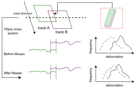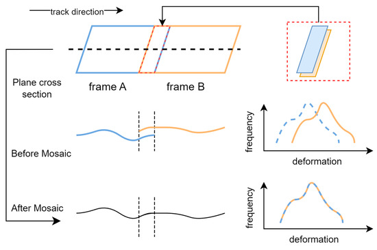 During the mosaicking process along the track, the deformation values of the overlapping areas of two adjacent frames changed from different deformation values to equal values. In Figure 3, the detailed outcome of the mosaicking operation along the track is presented.