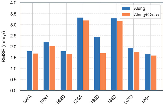 However, Track 172A displayed a marginal improvement (1.48 mm/yr vs. 1.41 mm/yr, Δ = 0.07 mm/yr), suggesting that cross-track integration benefits depend on track-specific geometries. Overall, the Along+Cross method achieved lower RMSE values in most cases, validating its superiority in deformation pattern characterization and predictive reliability. Further investigation into track-specific factors (e.g., overlap symmetry, GNSS station density) is recommended to optimize method selection under varying conditions.