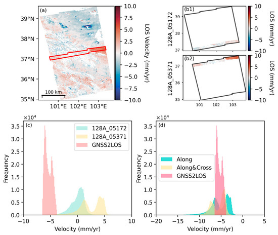 In the overlapping region along the track, a statistical comparison was conducted between the deformation of the original frame and that of the Along-track and Along+Cross track mosaics. The GNSS2LOS in subfigures (c,d) represents the data projected by GNSS onto the LOS plane. Subfigure (a) shows the spatial distribution of two adjacent frames along the track (128A_05172 and 128A_05371). The red box indicates their overlapping area. Subfigure (b1) displays the LOS velocity field for the overlapping area of the northern frame (128A_05172), while subfigure (b2) shows the LOS velocity field for the overlapping area of the southern frame (128A_05371).