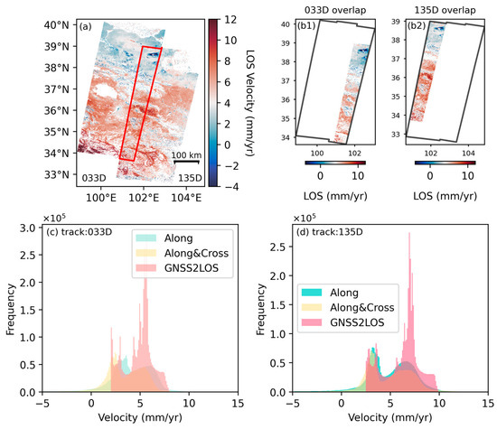 In the overlapping region across the tracks, a statistical comparison was conducted between the deformations of the Along-track and Along+Cross track mosaics. The GNSS2LOS in subfigures (c,d) represents the data projected by GNSS onto the LOS plane. Subfigure (a) shows the spatial distribution of two adjacent tracks (033D and 135D). The red box indicates their overlapping area. Subfigure (b1) displays the LOS velocity field for the overlapping area of the western track (033D), while subfigure (b2) shows the LOS velocity field for the overlapping area of the eastern track (135D).