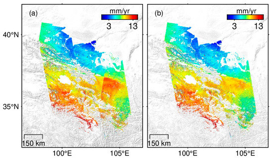 - Ou, Q.; Daout, S.; Weiss, J.R.; Shen, L.; Lazecký, M.; Wright, T.J.; Parsons, B.E. Large-Scale Interseismic Strain Mapping of the NE Tibetan Plateau from Sentinel-1 Interferometry. J. Geophys. Res. Solid Earth 2022, 127, e2022JB024176. [Google Scholar] [CrossRef]