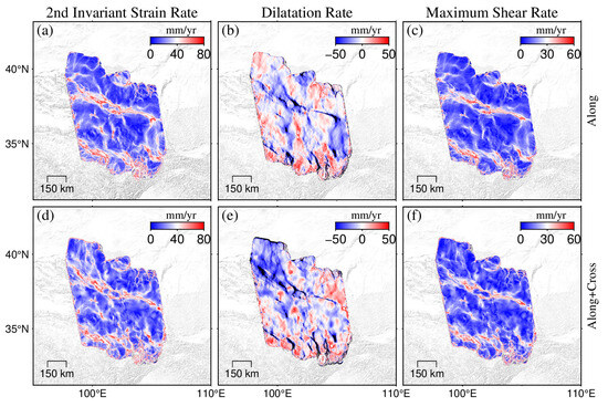 Using the inverted Ve velocity field from the LOS data and the V velocity field from the GNSS interpolation data, we calculated the associated strain rates for the two mosaic processes, as illustrated in Figure 11. First, it is important to highlight that the most accurate region of the Along+Cross mosaic method was situated in the central part of the study area (101°E~105°E, 35°N~37°N). This region circumvented the imperfections associated with mosaicking along only one side of the cross-track. By comparing the central plots of the two mosaic methods, we found that their strain rate distributions were approximately similar, with nearly equal high-value regions for both the dilatation rate and maximum shear rate. However, the Along+Cross mosaic distribution was more fragmented, with the high-value bands of the second invariant strain rate and maximum shear rate displaying a greater degree of bifurcation, while the high-value, flaky distribution of the dilatation rate transitioned to an islet distribution in the response region. This indicated an enhanced sensitivity of the Along+Cross mosaic method in detecting strain rates to some extent. However, it should be noted that the range of reliable regional data decreased.