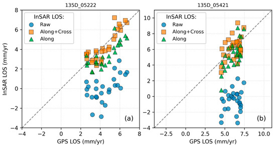 Figure 5c,f demonstrate the comparative performance of the Along and Along+Cross methods in processing the LOS deformation velocity field. The horizontal axis represents GNSS-derived LOS velocities, while the vertical axis corresponds to the mean velocity of all pixels within 500 m buffer zones centered on GNSS stations. The Along+Cross method achieves a marginal improvement in accuracy. For instance, in Figure 5c, blue markers (Along+Cross) exhibit tighter clustering along the y = x reference line compared to red markers (Along), with reduced deviation magnitudes quantifying the enhanced alignment of the LOS velocity field. This pattern persists in Figure 5f, where the Along+Cross results show superior agreement with projected GNSS velocities. The proximity of data points to the y = x line directly reflected the efficacy of each processing methodology, with the Along+Cross approach consistently minimizing systematic biases.