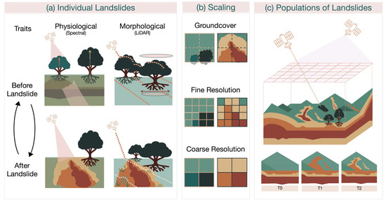 An ecosystem-centered view of landslides can benefit from the integration of remotely sensed hyperspectral and LiDAR data to better understand ecosystem-soil-lithology interactions at multiple scales. (a) At local scales, plant functional traits may contribute to slope resistance/susceptibility to failure (before landslides) and landslide recovery (after landslides). Plant physiological and soil/lithological attributes can be derived from hyperspectral data, whereas plant above-ground morphological traits can be derived from LiDAR data. The latter may be used to develop models establishing relationships with below-ground morphological traits. (b) The study of landslides comes with different challenges associated with the nature of mountainous terrain and the landslides themselves. Both rainfall and earthquake events can trigger hundreds to thousands of landslides over areas of variable extents within which landslides exhibit a large variability in size. This may require upscaling or downscaling hyperspectral and LiDAR data to address different sets of questions or overcome limitations of the data. (c) At regional scales, plant functional traits and derived measures of functional diversity can be used to better understand the contribution of ecosystem-soil-lithology interactions to slope stability as well as variation in the developmental trajectories of landslides at the scale of landslide populations and landslide assemblages.