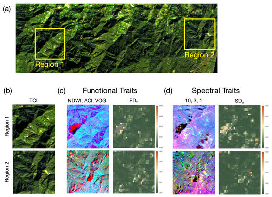 Functional and spectral traits, and corresponding diversity indices, derived from PRISMA hyperspectral data. (a) large region of the Sierra de las Minas of Guatemala (SLM), including focal areas (b–d), impacted by landslides. (a,b) are true-color RGB images TCI, (c) RGB composite of three functional traits (FT; vegetation indices) (left) and derived functional diversity metric (FDα; right), and (d) RGB composite of three spectral traits (derived from principal component analyses) (left) and corresponding spectral diversity metric (SDα; right). The three vegetation indices include the normalized difference water index (NDWI), Anthocyanin Content Index (ACI), and Vogelman Index 2 (VOG). The three components correspond to PC10, PC3, and PC1.