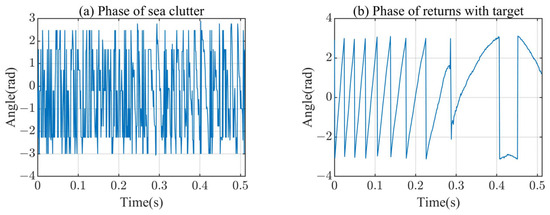 where Re[.] and Im[.] represent the real part and imaginary part respectively. The values of p(n) range from −π to π. Figure 1 plots the phase time series during 0.512 s from one IPIX radar dataset [29]. It is found that both sea clutter and returns with target exhibit pseudo-periodic properties in the phase time series. While their frequencies are obviously different. Sea clutter has a high frequency with a fast-varying property, due to its phase angle randomly distributed in the whole phase space. Inversely, returns with targets have a low frequency with a slow-varying property.