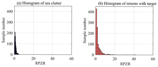 Histogram distributions of RPZR for (a) sea clutter and (b) returns with target.