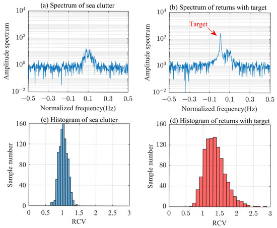 Doppler spectrum of (a) sea clutter and (b) returns with target. Histogram distributions of RCV for (c) sea clutter and (d) returns with target.