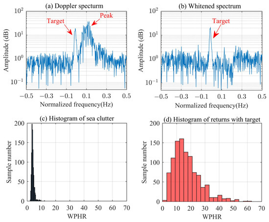 Whitened process of returns with target and histogram distributions of WPHR. (a) Doppler spectrum. (b) Whitened spectrum. (c) Sea clutter. (d) Returns with target.