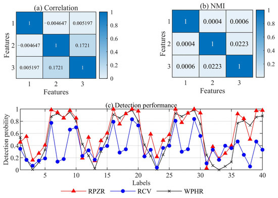 where represent variables of the RPZR, RCV, and WPHR respectively. When the absolute correlation coefficient is close to 0, the correlation between two variables is weak. Concretely, it can be classifier into five intervals of [0, 0.2], [0.2, 0.4], [0.4, 0.6], [0.6, 0.8], [0.8, 1] and the corresponding relationships are very weak correlation or no correlation, weak correlation, moderate degree of correlation, strong correlation, and very strong correlation. In Figure 5a, RPZR is independent of the other two features, since feature extraction from the different domains. There is little weak correlation between the RCV and WPHR, due to the same frequency domain.