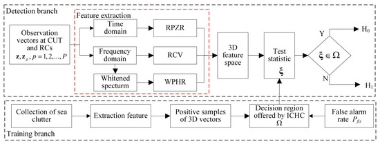 Figure 6 gives the flow diagram of the feature-based detector using an improved concave hull classifier (FB-ICHC). It contains an online detection branch and an offline training branch. In the online detection branch, both observation vectors at CUT and RCs are first utilized to extract three features in the time domain and in the frequency domain. Next, three features form a 3D feature space, and it functions as the test statistic. Finally, when the test statistic falls outside the decision region, it declares that CUT belongs to the H1 hypothesis. In the offline training branch, large amounts of sea clutter are collected to extract features. The positive samples of 3D vectors are trained for the ICHC with a controllable false alarm rate, which is provided for the detection branch.
