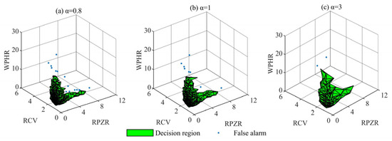 Figure 7 shows the generation of a concave hull when the sphere of radius α has different values. The green area represents the decision region generated from sea clutter samples, and the blue dots indicate false alarm points. As the sphere of radius α becomes larger, the volume of the concave hull is greater. If α tends to infinite, the concave hull degrades into a convex hull. That is, a convex hull is a special case of a concave hull with infinite radius. In the 3D feature space, the sample falling outside the concave hull is declared as a negative sample, which is a false alarm sample. The number of false alarm samples is 16, 8, and 2 respectively when α = 0.8, 1, and 3. Besides, there is a monotone decreasing relationship between parameter α and Pfa, though it is often difficult to their analytical expression. Therefore, the false alarm rate can be controlled by finding a suitable parameter α.