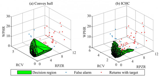 Figure 8 plots an example of two decision regions. The green area represents the decision region generated from sea clutter samples, the blue points indicate the locations of false alarm points, and the red points represent the samples from returns with the target. The total number of training samples is 10,210 and the false alarm rate is 0.001. Thus, 10 samples from sea clutter outside the decision region, are regarded as false alarm points. It is clearly found that the ICHC can offer a smaller decision region than the convex hull. Their volumes are 20 and 53 respectively. In the decision judgment, a smaller volume of decision region can improve the detection probability.