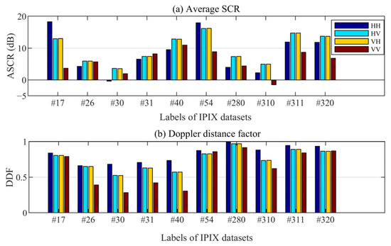 Figure 10 lists the average SCRs and DDFs in the ten IPIX datasets at four polarizations. The average SCRs have a large range from −2 dB to 18 dB, where cross-polarizations of HV and VH have higher SCRs than like-polarizations of HH and VV. The values of average SCR are smallest at VV polarization, and it may result in the worst performance in detection. The latter five datasets have greater values of DDF than the former five datasets. Among the former five datasets, the Doppler shifts of test targets fall inside the clutter regions in a great probability, especially the #30 dataset. In this way, it can be roughly classified into four groups. The first group is #17, #54, #311, and #320, with high SCRs and great DDFs. The second group is #280, #310 with low SCRs and great DDFs. The third group is #26, #30, and #31 with low SCRs and small DDFs. The fourth group is #40 with high SCRs and small DDFs. Besides, the ten IPIX datasets cover the sea state from 2 to 4. Therefore, it can provide a variety of clutter environments for a reliable performance evaluation.