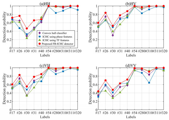 Detection results of single-class detectors (N = 512, Pfa = 10−3). (a) HH. (b) HV. (c) VH. (d) VV.
