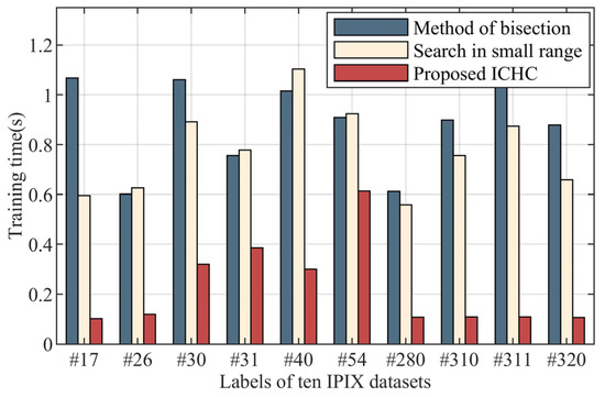 In real radar detection, the time for detection is often limited and it is required for fast implementation. In this way, we testify to the runtime of the proposed ICHC. The laptop computer is used with the Intel i9-13900HX CPU, 32G RAM, NVIDIA GeForce RTX 4070 laptop GPU, and MATLAB 2022b software in Windows 11. Figure 12 shows the training time for the concave hull with a controllable false alarm rate. The total number of training samples is 10,240. The first algorithm is the method of bisection for the suitable parameter in a wide range, according to the given false alarm rate. Based on the bisection search, the second algorithm has a small range using the prior knowledge of boundary samples. The third algorithm proposed in this paper further uses the adaptive search to quickly find the suitable parameter. Narrowing the boundary range of the α parameter cannot significantly reduce the training time when the other settings are the same. However, the adaptive search method can lead to a significant reduction in training time. The average training time for the bisection method across all data sets is 0.83 s, while the average runtime for the adaptive search method is 0.227 s, improving efficiency by over 70%. It demonstrates that the proposed ICHC can indeed establish the concave hull decision region for controlling false alarms more efficiently.