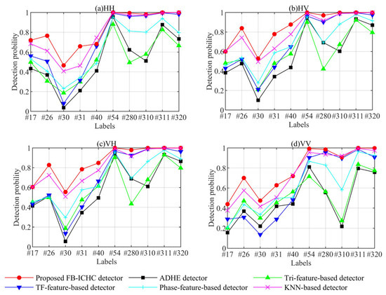 Detection results of six detectors at four polarizations (N = 512, Pfa = 10−3). (a) HH. (b) HV. (c) VH. (d) VV.