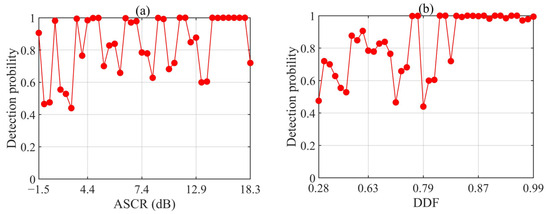 Figure 14 plots the influence of ASCR and DDF on the detection performance of the proposed FB-ICHC detector, where N = 512 and Pfa =10−3. In Figure 14a, as the values of ASCR increase, the detection probabilities are close to one. While, it has a little dependence on the ASCR, especially in the low ASCR cases. This means that there exist other factors playing the main role in detection. The DDF is discussed in Figure 14b. Indeed, the proposed FB-ICHC detector has a close relationship with DDF and detection probabilities. The reason is obvious. The phase feature of RPZR reduces the dependence on ASCR since ASCR is only related to the amplitude. The remaining two features of RCV and WPHR are determined by the Doppler spectrum and normalized Doppler spectrum. Especially, the greater the values of DDF are, the higher the detection probabilities of WPHR are.