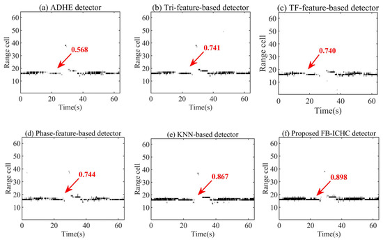 Detection results of six detectors in CSIR dataset (N = 512, Pfa = 10−3). (a) ADHE detector. (b) Tri-feature-based detector. (c) TF-feature-based detector. (d) Phase-feature-based detector. (e) KNN-based detector. (f) Proposed FB-ICHC detector.