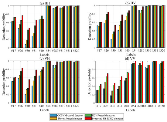 In Figure 17, both the OCSVM-based detector [23] and iForest-based detector [24] have eight features extracted from the time domain, frequency domain, and TF domain. At HH, HV, VH, and VV polarizations, the average detection probabilities of the OCSVM-based detector [23] are 0.696, 0.717, 0.717, 0.625 respectively, and that of the iForest-based detector [24] are 0.723, 0.750, 0.751, 0.673. While the eight features are partly correlated there must exist redundant information. In this way, the ECH-based detector [27] selects the optimal three features from eight features, achieving the average probabilities of 0.798, 0.810, 0.799, and 0.745. Relative to the ECH-based detector [27], the proposed FB-ICHC detector improves the detection probability by up to 21% on individual datasets, with an overall improvement of 5.5%. It verifies the performance superiority from well-designed three features and ICHC decision region.