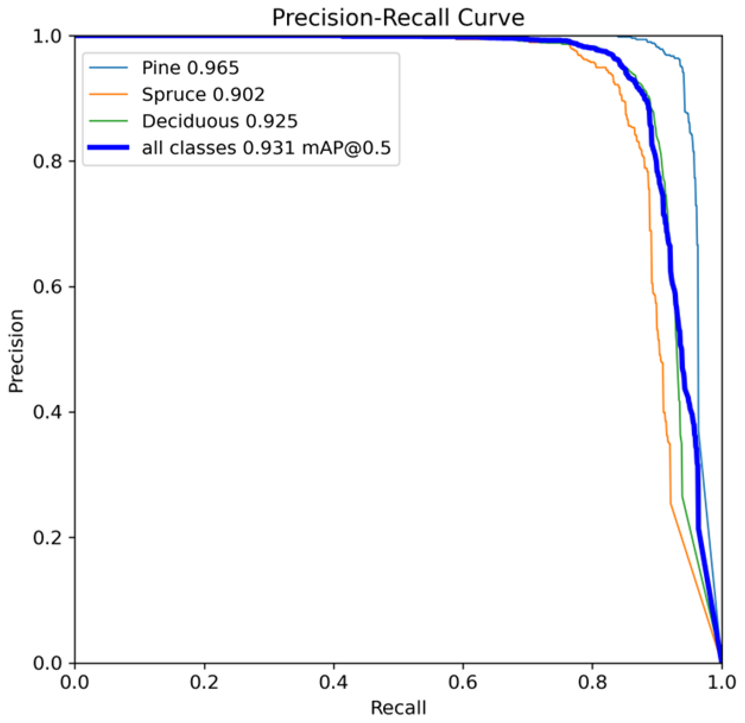The evaluation metrics for the YOLOv12 model are summarized in Table 4. The validation dataset comprises 30 images with 2696 annotated instances across three classes: Pine, Spruce, and Deciduous. The model revealed a precision of 95% and a recall of 87%, alongside a mean average precision (mAP) of 93% at a 50% intersection over union (IoU) threshold and 75% across various IoU thresholds from 50% to 95%. Among the three classes, Pine exhibited the highest detection performance, with a precision of 97%, a recall of 92%, mAP50 of 97%, and mAP50-95 of 80%. In contrast, Spruce showed the lowest recall (82%) and mAP50-95 (71%), indicating potential challenges in detecting all instances accurately, especially at stricter IoU thresholds. These findings emphasize the model’s effectiveness in identifying Pine and Deciduous species and suggest areas where Spruce tree detection can be enhanced. The overall accuracy calculated from the confusion matrix (total number of correct predictions/ total number of predictions) was 79%. Additionally, the Kappa and MCC matrices were 66% and 67%. More information on precision and recall is provided as a precision–recall curve in Figure A4.