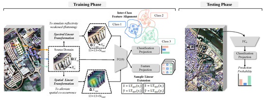 Flowchart of the proposed method. The training stage includes spatial-spectral linear expansion and inter-domain feature alignment. A fundamental CNN classifier backbone (marked in gray, combined with 2D convolution, ReLU activation, maximal pooling, and fully connected layer) with feature and category projection used for training. and represent two image patches generated by from the SD. and are pixels (one-dimensional spectrum) from and , respectively. The embedding features of , , and output by the projection head are shown as a square, trapezoid, and regular hexagon. In the test stage, a CNN classifier backbone with category projection is used for the prediction of the image patch from the TD.