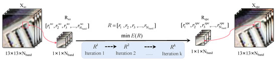 The gradient descent algorithm in Algorithm 1 is adopted to calculate from Equation (4). In this process, the initial value is designated as , and the step size is set as 0.1. The number of iterations K is set to 31. The augmented patch cube (13 × 13 × ) is obtained by applying Equation (5) to all pixels from (where u and v represent the horizontal and vertical coordinates in the image patch, respectively).