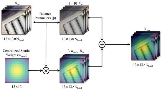 Maximum and minimum normalization are applied using Equation (7). The augmented patch cube (13 × 13 × ) is obtained by applying Equation (8) to all spectral channels from . can be regarded as a spatial weighted resampling. is a balancing parameter, which is set so as not to interfere with the model’s learning of the original spatial-spectral joint distribution.
