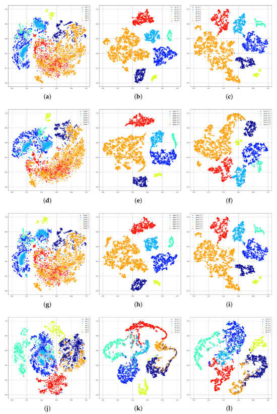 T-SNE of class separability of the SSLE using the Pavia dataset, where SD is the PaviaU data, TD is the PaviaC data, and the number represents the class index. (a) Raw sample of SD (). (b) SD () feature vectors by feature projection (P). (c) SD () feature vectors by feature projection (P) without . (d) Samples of . (e) feature vectors by P. (f) feature vectors by P without . (g) Samples of . (h) feature vectors by P. (i) feature vectors by P without . (j) Raw samples of TD. (k) TD feature vectors by P. (l) TD feature vectors by P without .