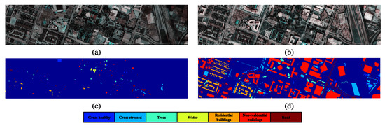 Pseudocolor image and ground-truth map of S-H [20]. (a) Pseudocolor image of Shanghai. (b) Pseudocolor image of Hangzhou. (c) Ground-truth map of Shanghai. (d) Ground-truth map of Hangzhou.