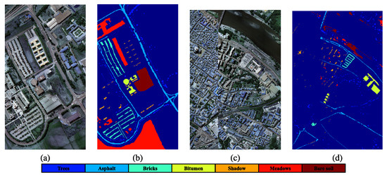 Pseudo-color image and ground truth map [20,58] of Pavia dataset: (a) Pseudo-color image of University of Pavia, (b) Ground truth map of University of Pavia, (c) Pseudo-color image of Pavia Center, (d) Ground truth map of Pavia Center.