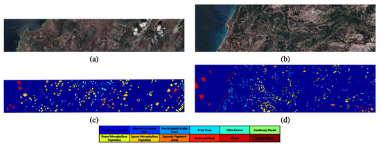 Pseudocolor image and ground-truth map of HyRANK [59]. (a) Pseudocolor image of Dioni. (b) Pseudocolor image of Loukia. (c) Ground-truth map of Dioni. (d) Ground-truth map of Loukia.