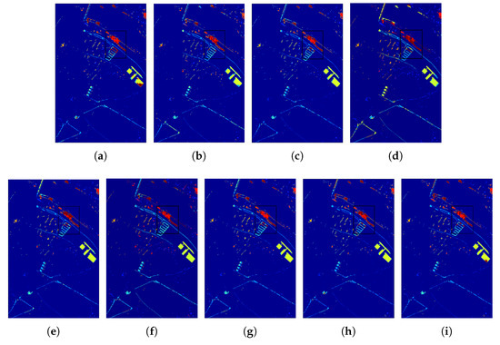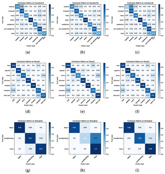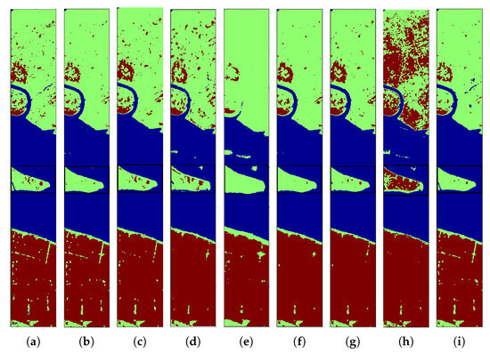 Figure 5 shows the visualization results of the features extracted by CRM on , and following t-SNE [54] using PaviaU as the SD and PaviaC as the TD. As illustrated in Figure 5a,d,g, the better aggregation and separability of the feature projection of , , and indicate that the classifier was capable of learning a domain-invariant feature mapping. The cluster centers of the same category in Figure 5b,e,h are close together and do not overlap, showing that the and could successfully preserve domain-specific information. Although the model was transferred directly to the TD, which is substantially distinct from the SD, the classifier still showed a reliable generalization performance, as shown in Figure 5j,k.